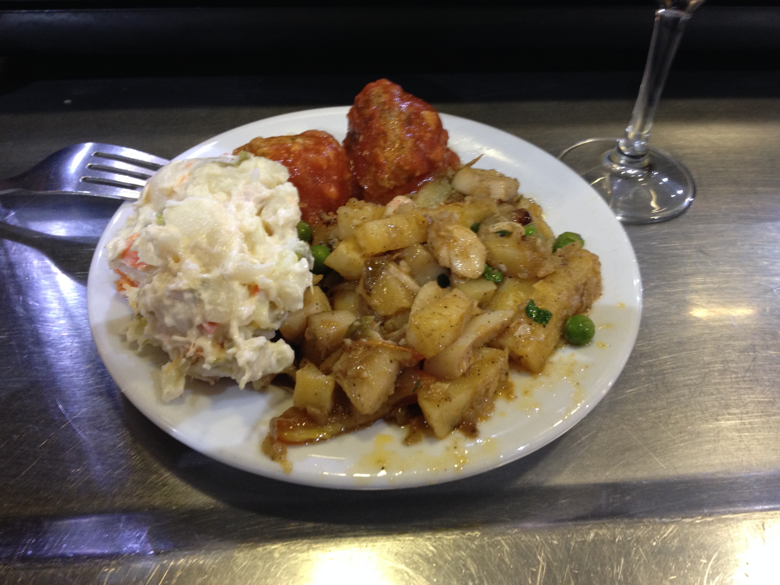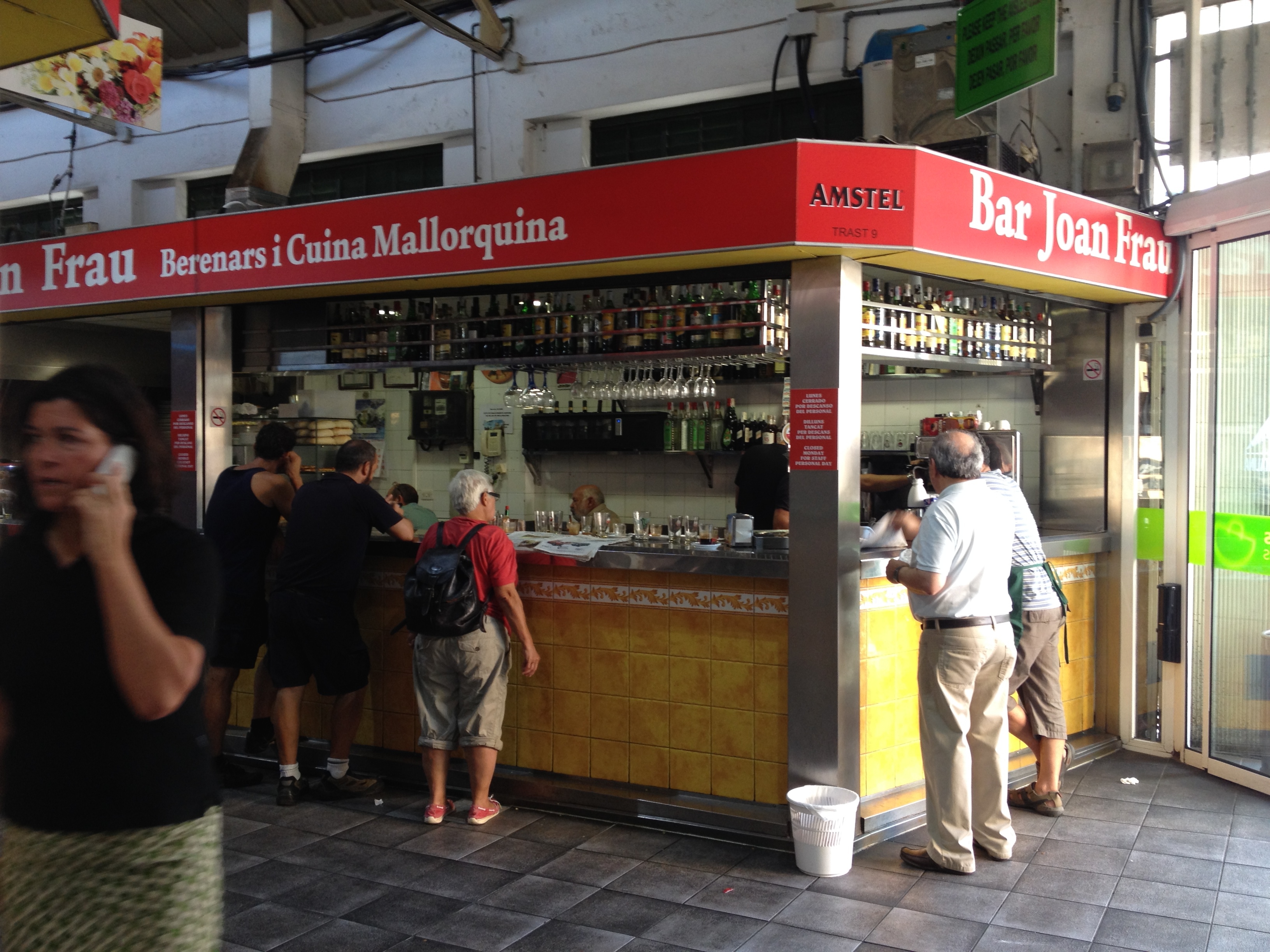 Zuallererst auf meiner „Lieblinge“-Liste kommt die Bar Joan Frau, die von Gabriel, Mario und Pedro betrieben wird. Diese Bar hat eine einmalige Atmosphäre und ganz exzellente Raciónes, das sind warme Speisen, die es in kleinen (Tapas) und mittleren Portionen (Raciónes) gibt. Auch Kombinationen sind beliebt (Variados) – auf dem Foto eine Ración aus drei Tapas: Ensaladilla Rusa (Eiersalat), Albóndigas (Fleischbällchen) und Frito de Sepia. Viele Mallorkiner essen sowas schon zum Frühstück und das geht sehr gut, zusammen mit einem Glas Vino tinto.