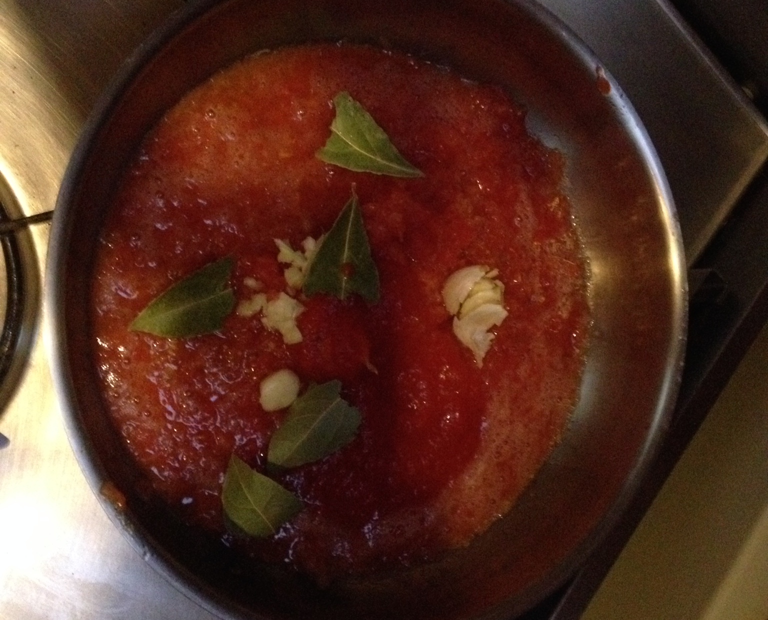 Die geriebenen Tomaten zusammen mit den Knoblauchzehen, den Lorbeerblättern und dem Öl in einer Pfanne auf mittlerer Hitze so einkochen, dass die Sauce weder zu flüssig noch zu trocken ist.