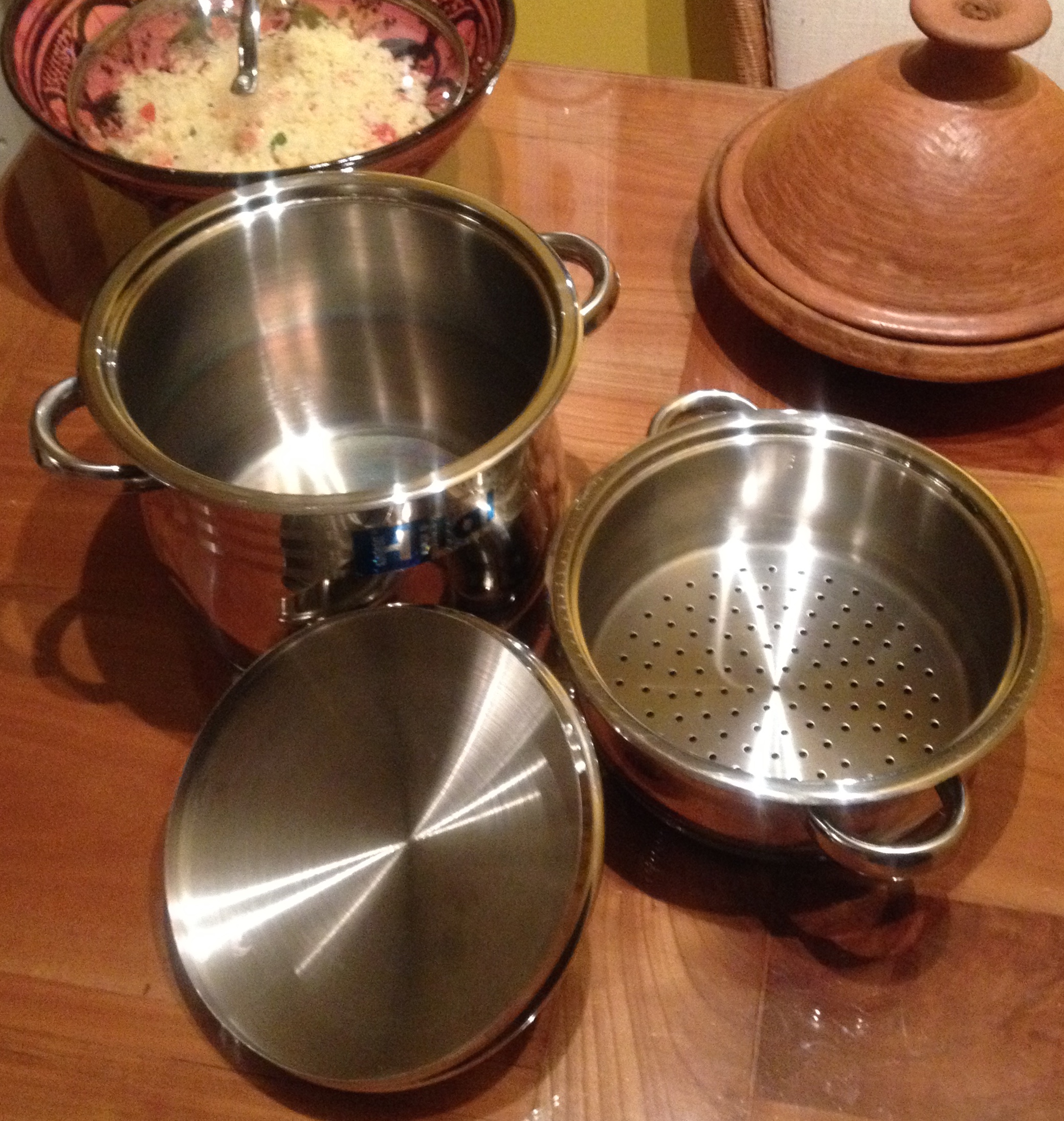 Um ein gutes Ergebnis zu erzielen, empfehle ich dir ein spezielles Kochgeschirr: Die Couscoussiere. Das ist ein dreiteiliger Topf (Topf, Siebaufsatz und Deckel) und dazu brauchst du noch eine große flache Schale.
