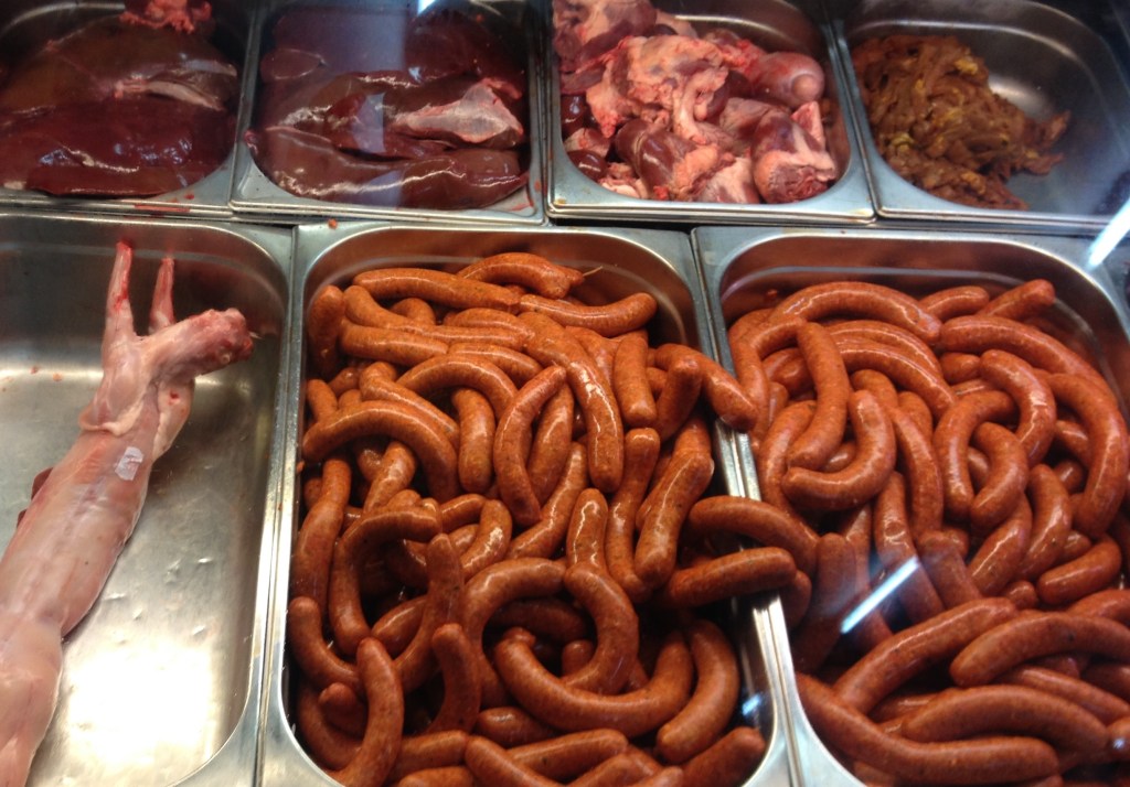Der Markt bietet nicht nur frisches Obst und Gemüse, sondern betreibt eine eigene Metzgerei und eine Frischfisch-Theke. Die Preise für Fleisch und Fisch sind günstig. Allerdings ist das Fleisch nicht Bio, weshalb ich hier meist nur Lamm kaufe. Die Fische, z.B. die Doraden, sind aus der Zucht also nicht wild, was einen erheblichen Geschmacksunterschied mit sich bringt – da gehe ich eher zu Nikolaou (der Pulpo hier ist jedoch günstig und gut).