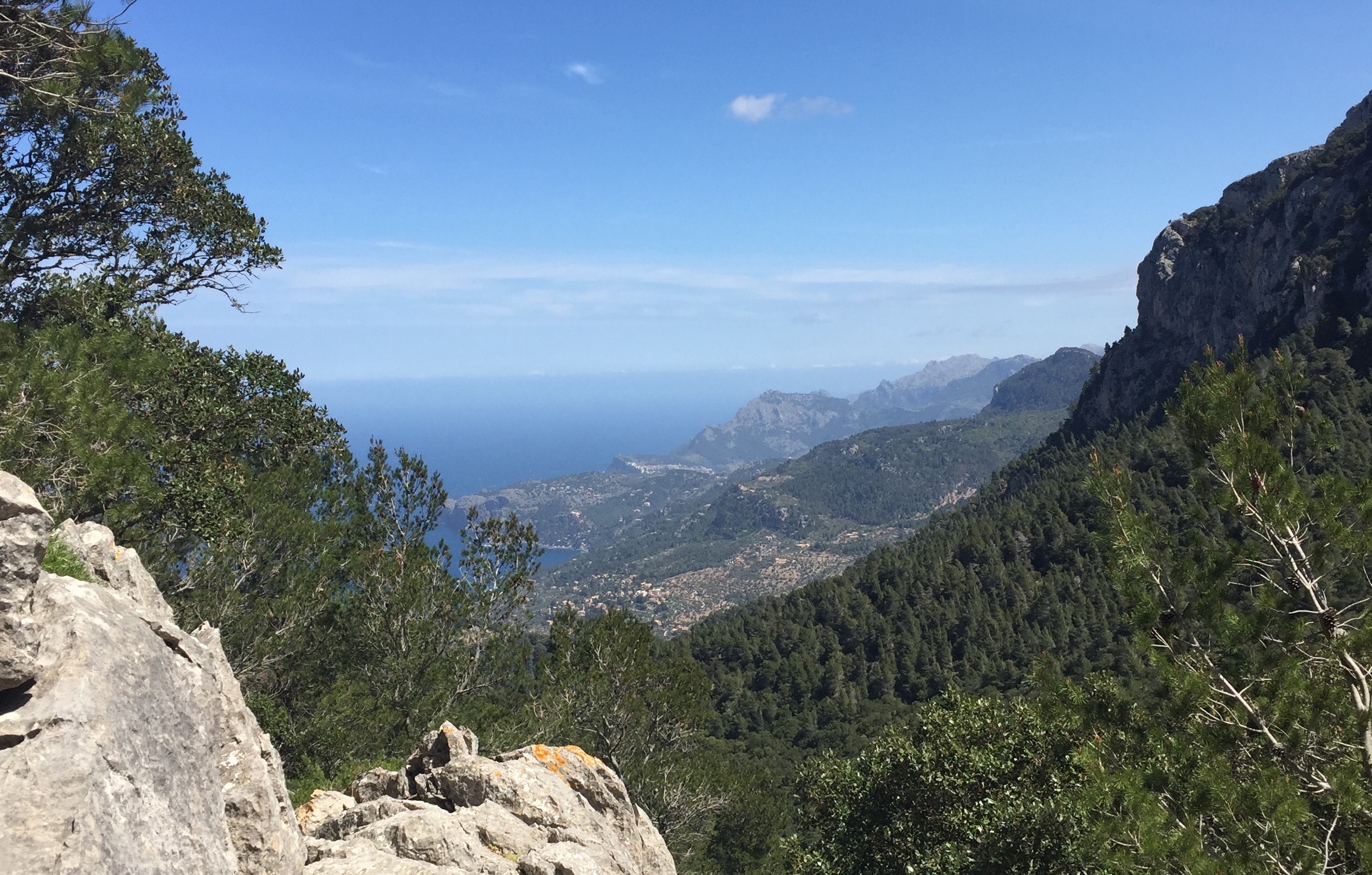 Tischgespräch im April 2017. Diese Wanderung besteht eigentlich aus einem Waldspaziergang auf dem Weg der Eremiten und zwei Wanderungen: Dem Weg über den Coll de Son Gallard und auf der anderen Seite herunter nach Valldemossa.