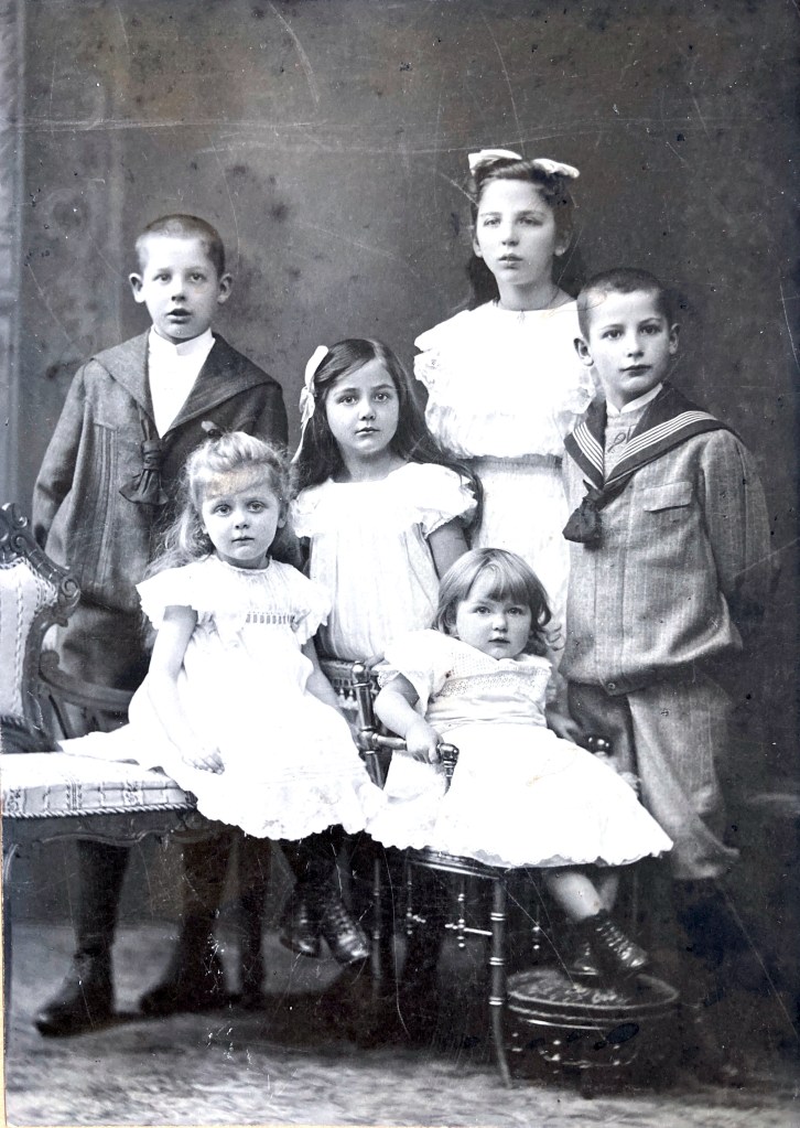 Die Schulte-Kinder. Julius, Ati, Elisabeth, Lene, Maria und Julius ca. 1906.