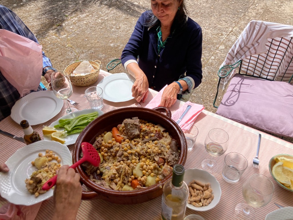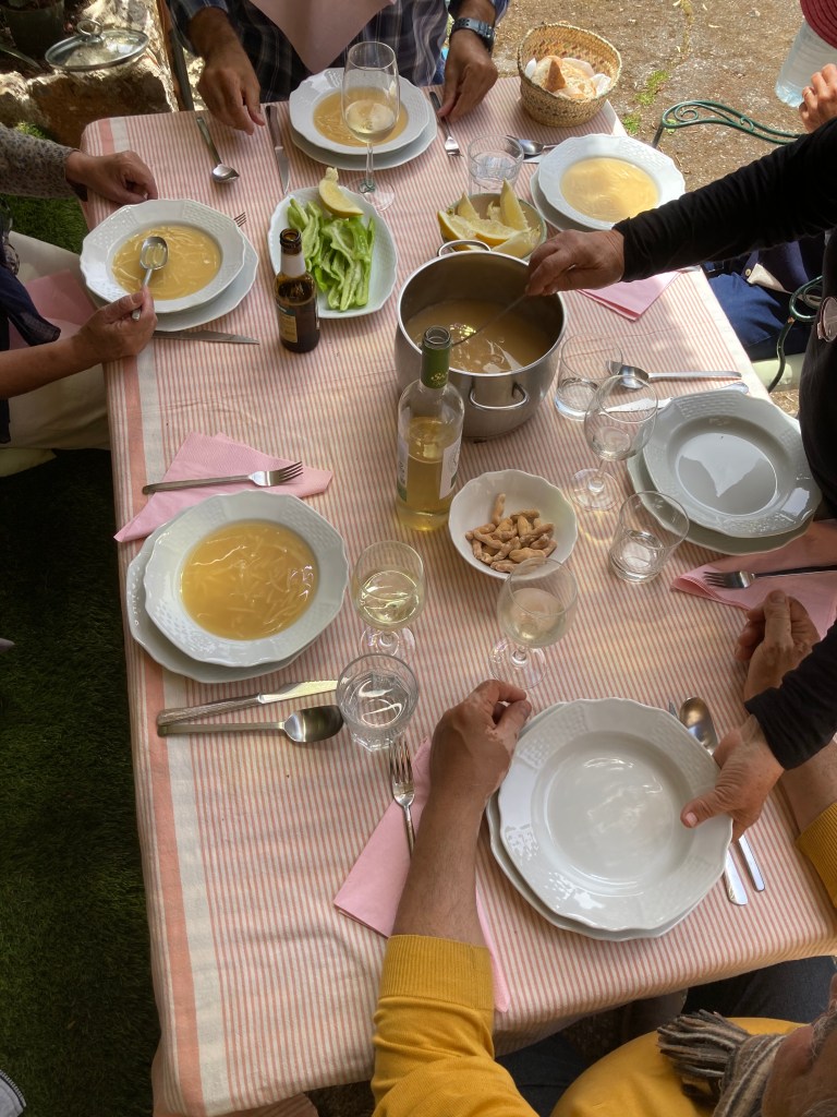 Auf Mallorca wird die Suppe mit Reis oder Nudeln vorab serviert. In diesem Fall fand das Essen an einem der ersten warmen Tage im April draußen auf Alicias Terrasse statt.