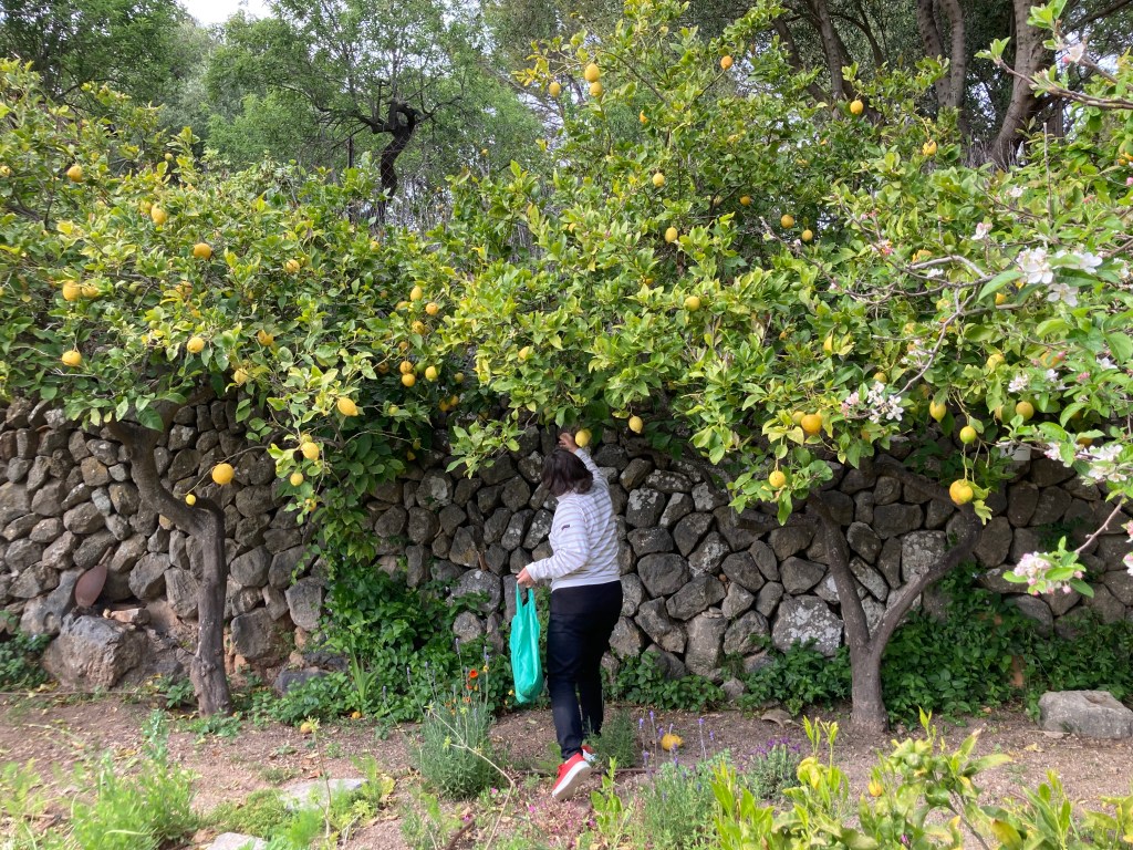 Als Abschiedsgeschenk gibt’s ein paar Zitronen aus Alicias Garten. Die mallorquinischen Zitronen stehen ihren Artgenossen von der italienischen Amalfiküste in nichts nach, finde ich. Sie sind saftig, nicht sauer, und haben eine schöne dicke Schale. Sehr gut geeignet für Hähnchen mit Zitrone, Nudeln mit Zitronensauce oder Tarta Limon