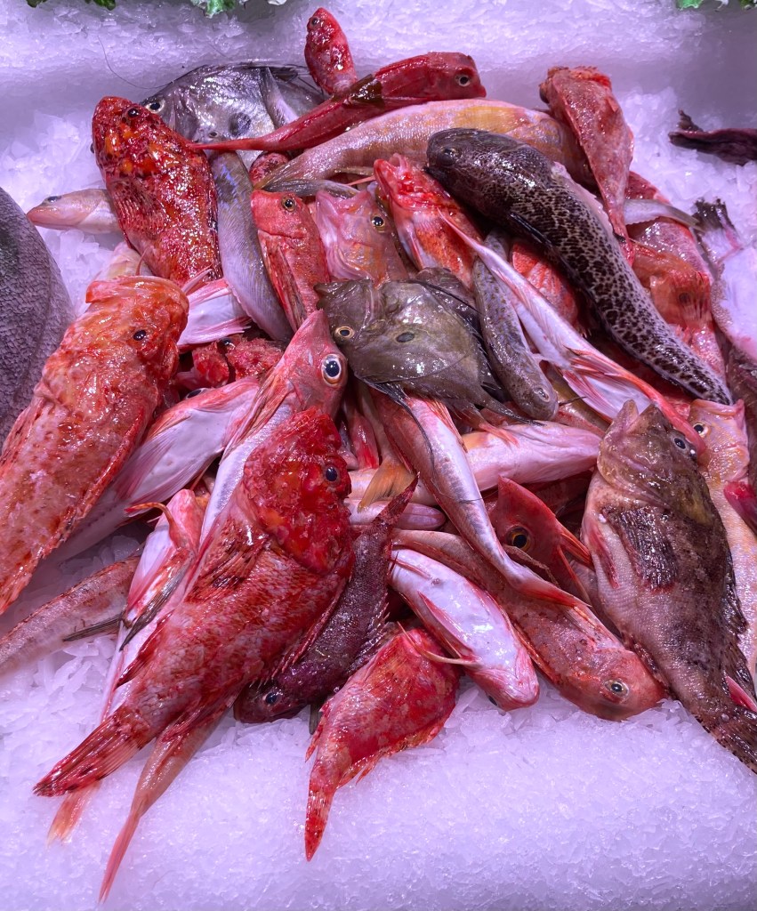 Die Fischmischung, die ich für den Fond nehme, nennen die Mallorkiner Morralla. Im Wesentlichen ist das eine Mischung von Edelfischen, die aber zu klein sind, um als Einzelexemplare verkauft werden zu können (Du erkennst auf dem Foto etwa zwei kleine Petersfische). Wie üblich auf der Insel werden Fische küchenfertig geputzt gekauft.