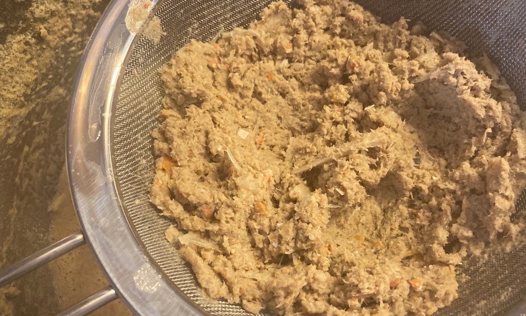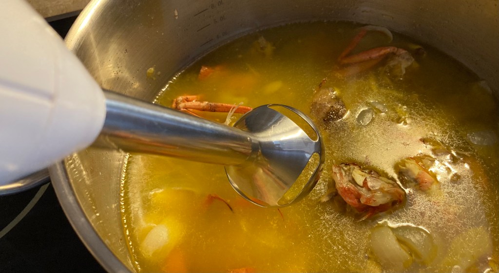Die Fische in der Brühe mit einem Zauberstab gründlich pürrieren und durch ein feines Sieb passieren. Dabei die Masse leicht ausdrücken und dann wegwerfen.