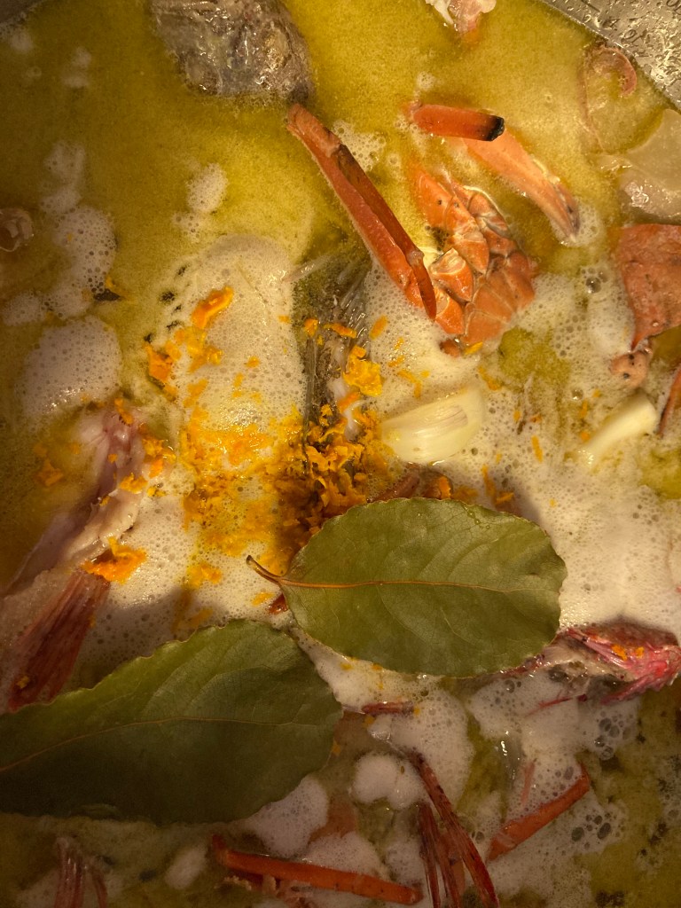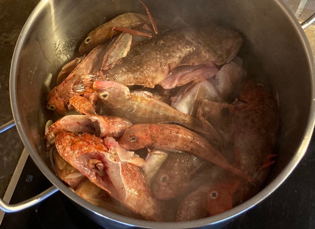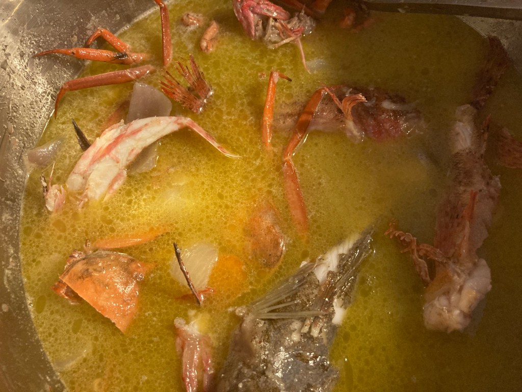 Das ist gelogen! Eigentlich ist dies gar keine typisch mallorkinische Fischsuppe, sondern ein mehr oder weniger typischer Fischfond, den ich für eine Suppe verwende, die an ein Rezept von Paul Bocuse angelehnt ist. So … DAS ist die Wahrheit!