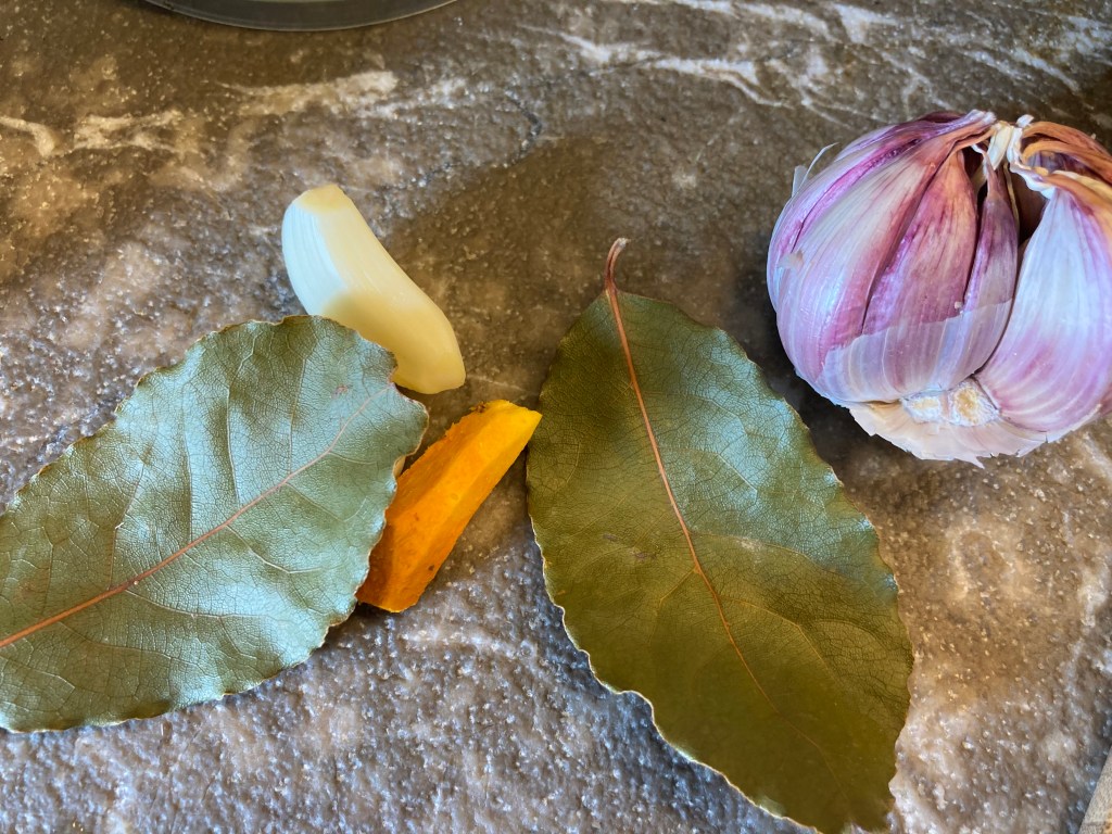 Die Brühe vom Herd nehmen und etwas abkühlen lassen. Die Lorbeerblätter entfernen.
