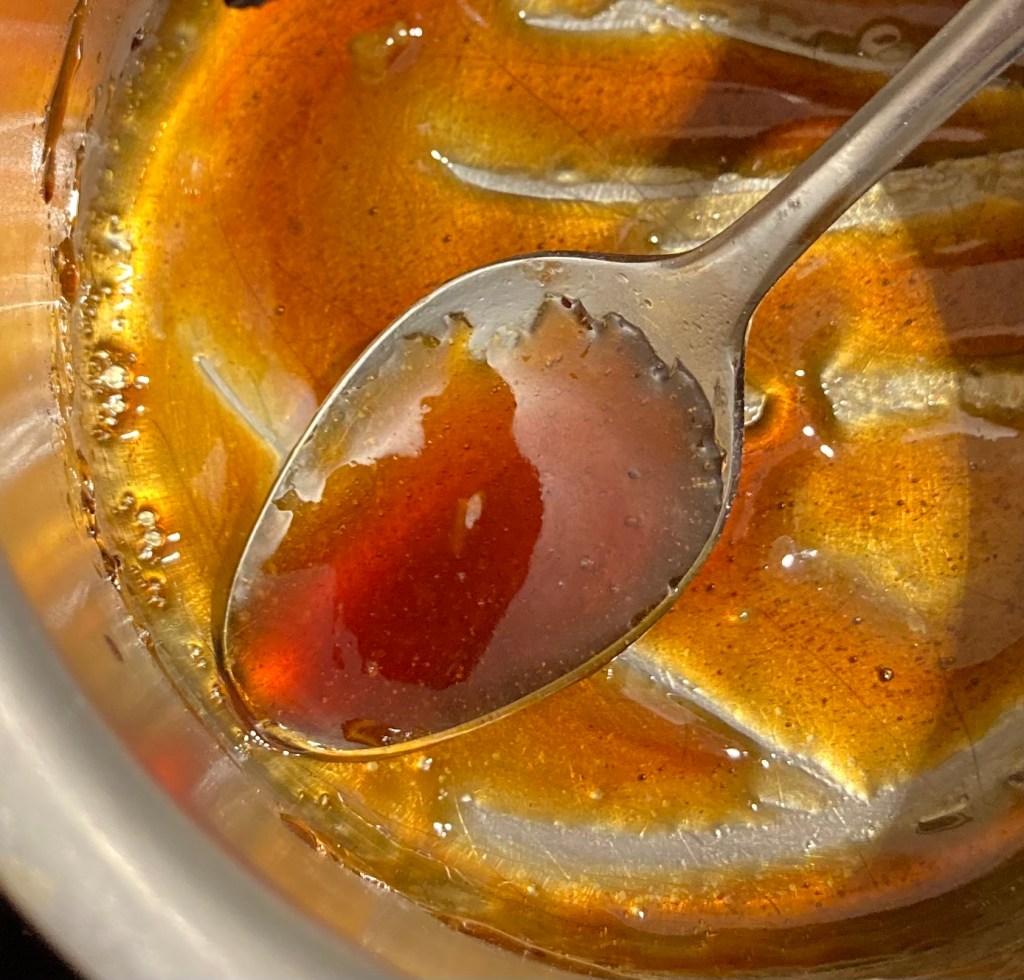Wasser und Zucker zusammenrühren und in einen Topf geben (aus Kupfer, wenn du hast). Auf hoher Stufe aufkochen und bräunen lassen. Wenn der Sirup eine gute Farbe angenommen hat, Apfel und Rosinen dazugeben und vorsichtig im Karamell ein paar Mal wenden. Vom Herd nehmen.